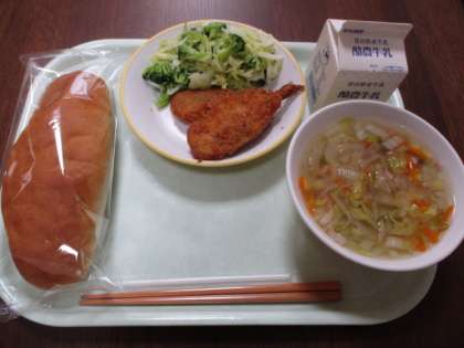 今日はあじフライです。あじは「味が良い魚」ということから名前がついたと言われるほど、とっても美味しい魚です。こんがりと揚がったあじフライは、肉厚なうえにサクサクとした食感で、ふだんは「魚が苦手」という子も「おいしい!」と言ってよく食べていました。