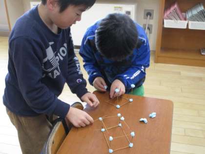 2年生は算数科で、竹ひごとねん土を使ってはこの形作りに挑戦しました。