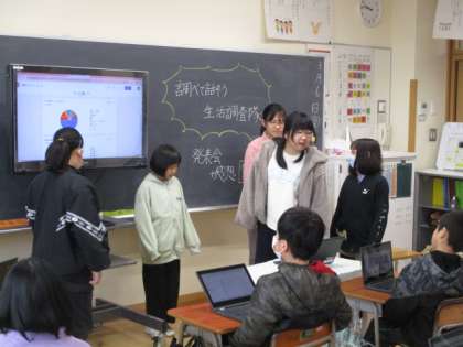 4年生は国語科「調べて話そう、生活調査隊」の学習で、グループごとに調査結果について発表しました。