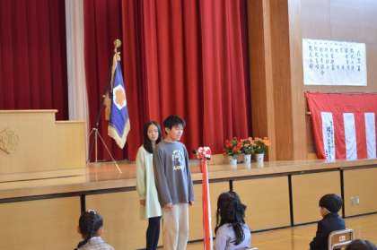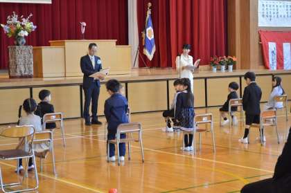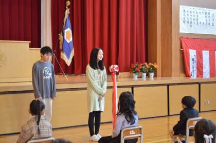 担任の先生から名前を呼んでもらいました。大きな声で返事ができる1年生でした。そのあと、6年生の児童代表から、歓迎の言葉がありました。