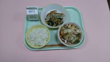 今日の給食です。 【献立】 ごはん 牛乳 焼きぎょうざ 海藻サラダ 肉豆腐 です。