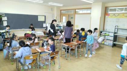 今日も朝から1年生教室には、6年生がいます。1年生のお手伝いありがとうございます。