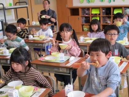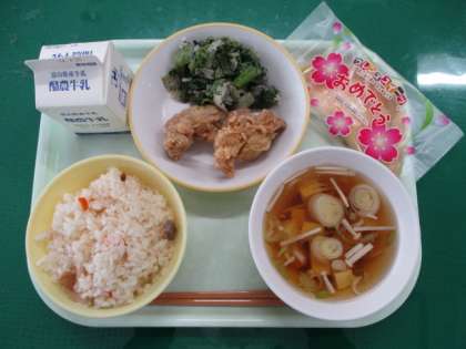 今日は、1年生の入学お祝い献立です。「今日の給食、とくにおいしかったもん」と、早々と食べ終わっている子もいました。いつもよりおいしくいただきました。