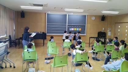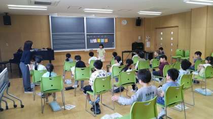 2年生の3時間目は、音楽科の学習でした。音楽室で「子犬のビンゴ」という曲を楽しく歌っていました。リズムに合わせて手をたたいたり、友達の背中をたたいたりするなど、楽しく動いて活動していました。