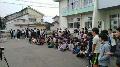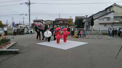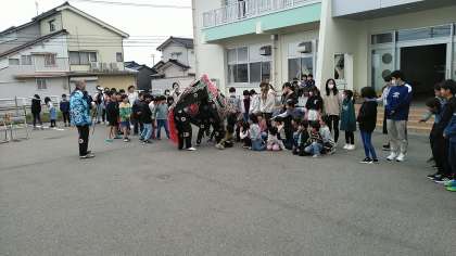 布目の獅子舞が学校にやってきました。本校の子供たちも参加していました。