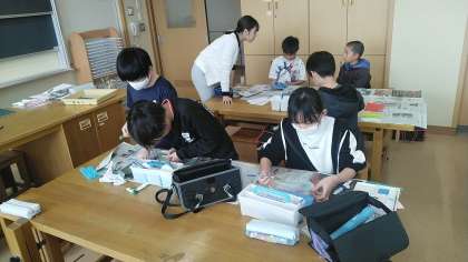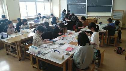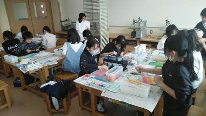 5年生は、四等分した画用紙を持って図工室に移動していました。水彩絵の具を使って、「心のもよう」を画用紙に表現しようとしていました。スパッタリングやグラデーション等の技法も用いながら取り組んでいました。