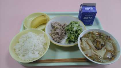 今日の給食です。 【献立】 ごはん 牛乳 豚肉の塩こうじ炒め きざみ和え ワンタンスープ バナナ です。