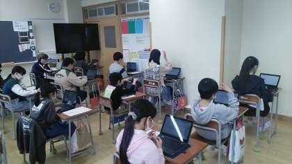6年生は、1時間目に全国学力学習状況調査の質問紙に取り組んでいました。webで解答するので、クロームブックを使って回答していました。
