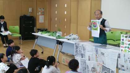 2年生の3時間目は、「旬の野菜や果物」に関する実感・体験学習会でした。外部講師の先生の話を子供たちは食い入るように聞いていました。