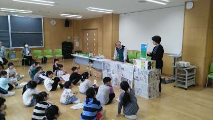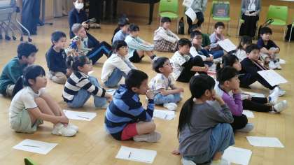 2年生の3時間目は、「旬の野菜や果物」に関する実感・体験学習会でした。外部講師の先生の話を子供たちは食い入るように聞いていました。