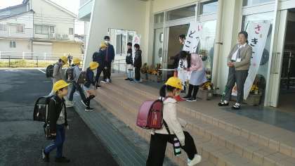朝の児童玄関の様子です。気持ちのよい「おはようございます」がたくさん聞こえてきます。