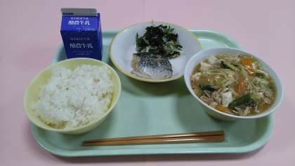 今日の給食です。 【献立】 ごはん 牛乳 さばのみそ煮 ごま酢和え 豆腐と野菜のうま煮 です。