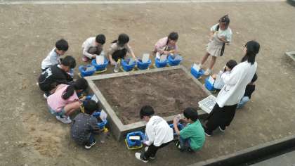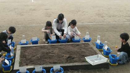 1年生の5時間目も、生活科の学習でした。あさがおの種を植えた鉢を花壇の周りに移動して、水をたっぷりあげていました。