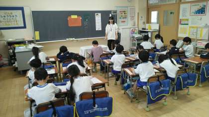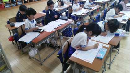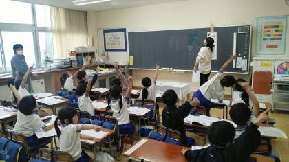 1年生の1時間目は、国語科の学習でした。ひらがなの「つ」について学習していました。みんなで、「つ」の入っている文章を確認したり、「つ」を空がきしたりしていました。