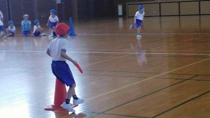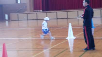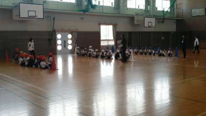 1・2年生の3時間目は、体育科の学習でした。体育館で折り返しリレーをしていました。折り返す時のコース取りがポイントかも…。