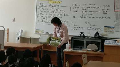 5年生は、3時間目に図書室にいました。図書館司書の先生の読み聞かせを聴いていました。