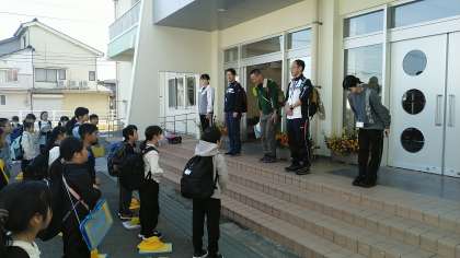 4年生は、今日、呉羽青少年自然の家に校外学習に行きます。児童玄関前で出発式をしました。