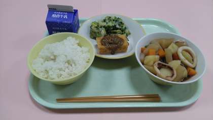 今日の給食です。 【献立】 ごはん 牛乳 揚げ出し豆腐のごまだれかけ 昆布和え いかと野菜の煮物 です。