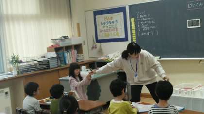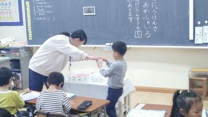 5時間目の終わり頃に、1年生教室では、帰りの準備をしていました。明日ある尿検査の容器等を無くさないようにと、一人一人手渡しされていました。