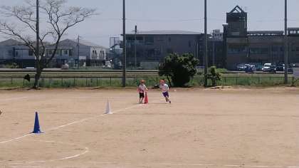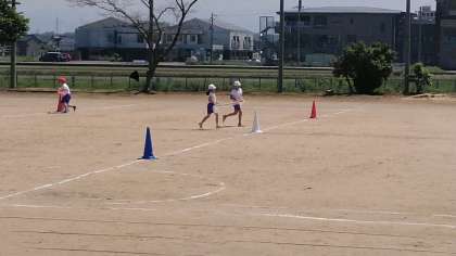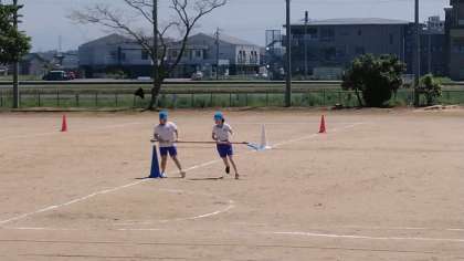 5・6年生の5時間目は、体育科の学習でした。グラウンドで、団体競技の練習をしていました。まわりかたがポイントですね。