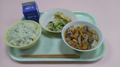今日の給食です。 【献立】 菜めし 牛乳 千草焼き おひたし かやくうどん です。