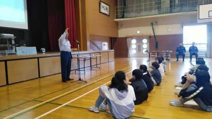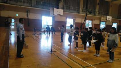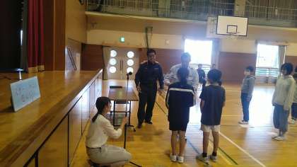 3時間目に、5年生は、BFCのバッジ授与式を行いました。富山北消防署和合出張所から浦田所長さんと3名の消防士さんに来てもらい、BFCのクラブ員になった証であるBFCのバッジをいただきました。バッジをいただいたあと、全員で誓いの言葉を読み上げました。