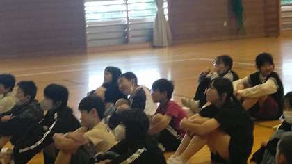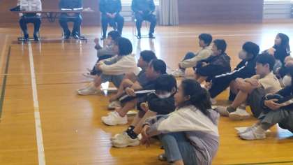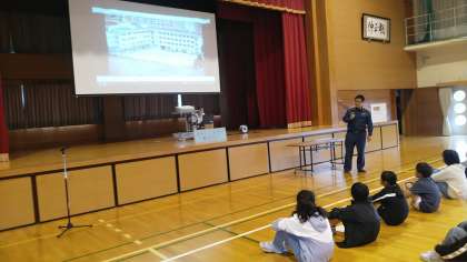 バッジ授与式のあと、防火教室を行いました。まず、体育館でDVDを見て、防火について学習しました。