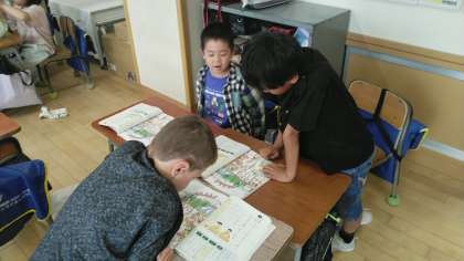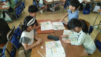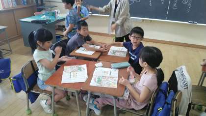 2年生の1時間目は、国語科の学習でした。グループごとに、友達が特徴のヒントをくれた「私」を教科書の絵の中から捜していました。