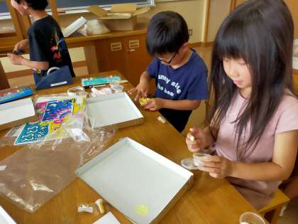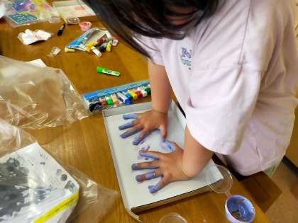 好きな色を混ぜて素敵な色をつくっています。 手の跡を付けたり指で描いたりしています。