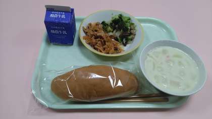 今日の給食です。 【献立】 コッペパン 牛乳 ポークチャップ ビーンズサラダ クリームスープ です。