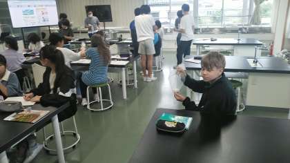 6年生の5時間目は、理科の学習でした。人間が酸素を吸って、二酸化炭素をはいていることを確かめる実験をしていました。はいた息を袋にためて、石灰水につけていました。見事に白くなっていました。
