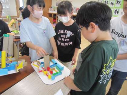 みんなの作品が完成したので、最後に、みんなの作品で実際にビー玉を転がしてみました。友達の作品のおもしろいところをたくさん見付けました。
