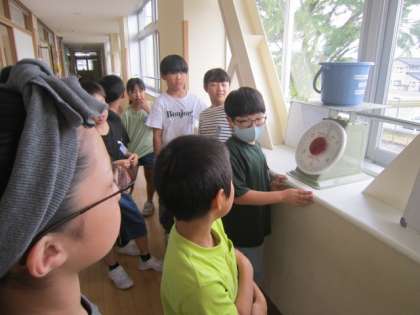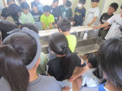 社会科の学習では、自分たちがどれくらい水を使っているかを確かめるため、手を洗ってその重さを測りました。大量の水を使っていると気付いた子供たち。水はいったいどこからきているのか、「調べたい!」とやる気満々の子供たちです。