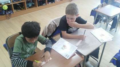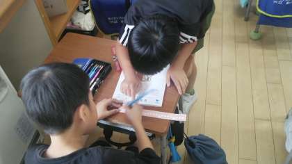 2年生の1時間目は、算数科の学習でした。長さの学習中で、教科書から切り取った紙テープに数字を書き込んで、マイものさしをつくっていました。