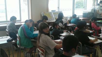 6年生の2時間目は、外国語科の学習でした。英語で文章をかいてみたらしいのですが、細かいところでうまくかけていないらしいです。