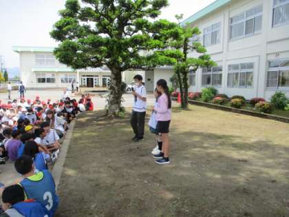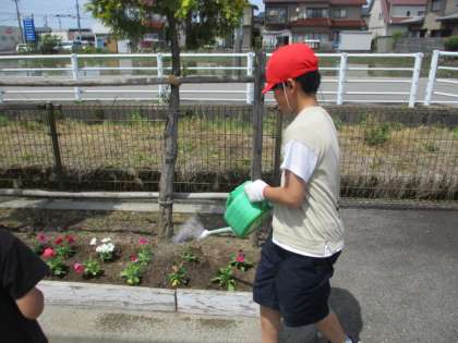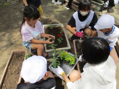 全校みんなで、プランターに花の苗を植えました。ファミリー班で協力してまた、進んで水やりをしたり、プランターを重そうに運んでいる班を別の班の子供が進んで助けたりする素敵な姿も見られました。