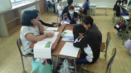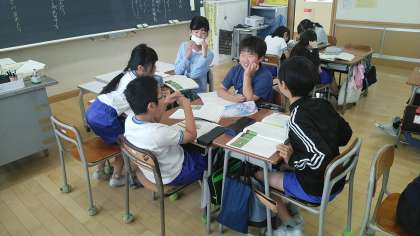 4年1組の1時間目は、国語科の学習でした。説明文の学習で、筆者の「何かを伝えるときには、このアップとルーズを選んだり組み合わせたりすることが大切です」という説明の満足度についてグループで話し合っていました。けっこう高い満足度の人がたくさんいました。