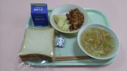 今日の給食です。 【献立】 食パン 牛乳 チリコンカン こふきいも キャベツスープ ポケットチーズ です。