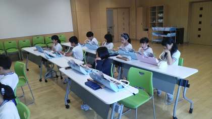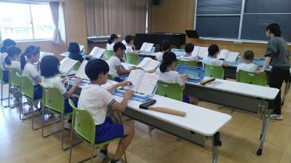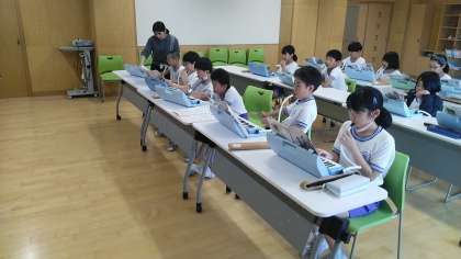 3時間目に音楽室の近くを通ると、鍵盤ハーモニカのすてきな音色が聴こえてきました。中に入ると、4年2組が鍵盤ハーモニカの練習をしているところでした。「いいこと ありそう」という曲だそうです。