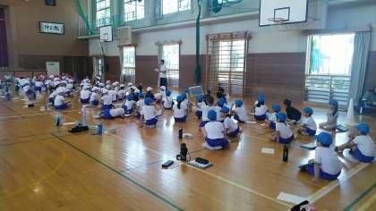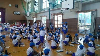 5時間目の始まるちょっと前から、ファミリー班ごとに行う「新体力テスト」が行われました。まず、体育館に集まって諸注意等がありました。
