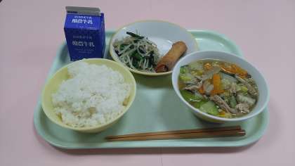 今日の給食です。 【献立】 ごはん 牛乳 春巻き 塩ナムル 八宝菜 です。