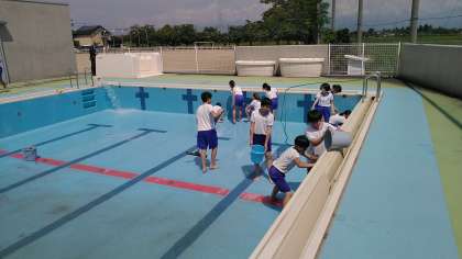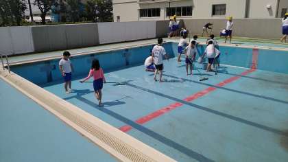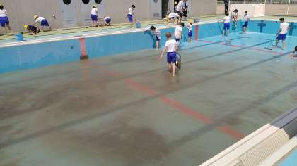 6年生は、午後からプール掃除でした。プールの中の掃除が担当で、スポンジで丁寧に磨いていました。まだ、新しいプールなのですが、けっこう汚れをとるのが大変でした。