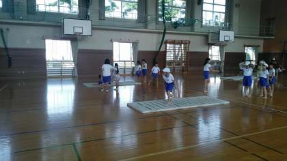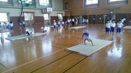 4年生の2時間目は、体育科の学習でした。体育館でマット運動をしていました。中には、難しい技に挑戦する子供たちが何人かいました。