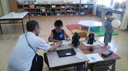 つばめ野級2組の1時間目は、国語のドリルをしたり、風船でバランスをとったりなどしていました。