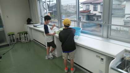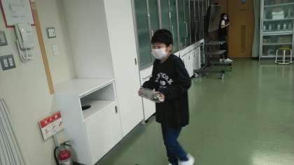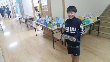 5年生は、今朝のきらきらタイムに自分の育てているメダカの水槽(ペットボトル)に、石や水草を入れてメダカの住みやすい環境をつくっていました。