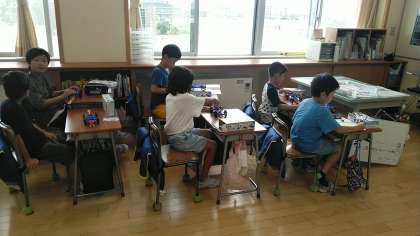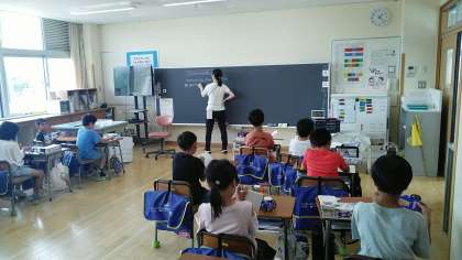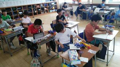 3年生の5時間目は、理科の学習でした。教室の真ん中に巻き尺二つで直線コースがつくられていたので、このあと、おそらくゴムで動く車のレースが行われるみたいです。