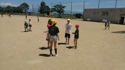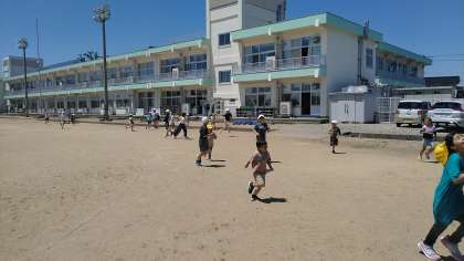 今日のひいらぎタイムの様子です。グラウンドでファミリー班ごとに遊びました。
