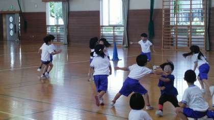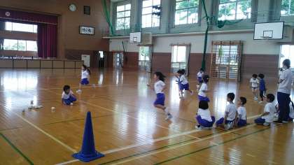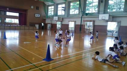 1年生の3時間目は、体育科の学習でした。体育館で活動していました。10個のお宝(玉)をチームごとに取ったり守ったりするゲームをしていました。