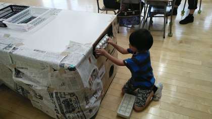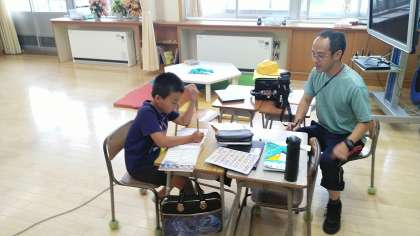 つばめ野級2組の1時間目は、それぞれの活動を進めていました。1年生は、基地づくりで基地を守るビームをつくっていました。4年生は、言葉のドリルを進めていました。