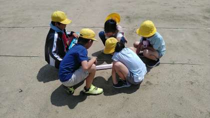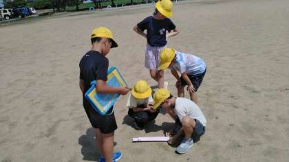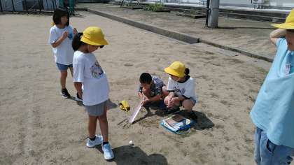 4年生は、5時間目に1組と2組がそろってグラウンドで活動していました。グループごとに分かれて卓球の玉を使って何やら観察をしていました。聞いてみると、グラウンドの傾きを調べているということでした。プール側から校舎側に向かって傾いている(低くなっている)そうです。